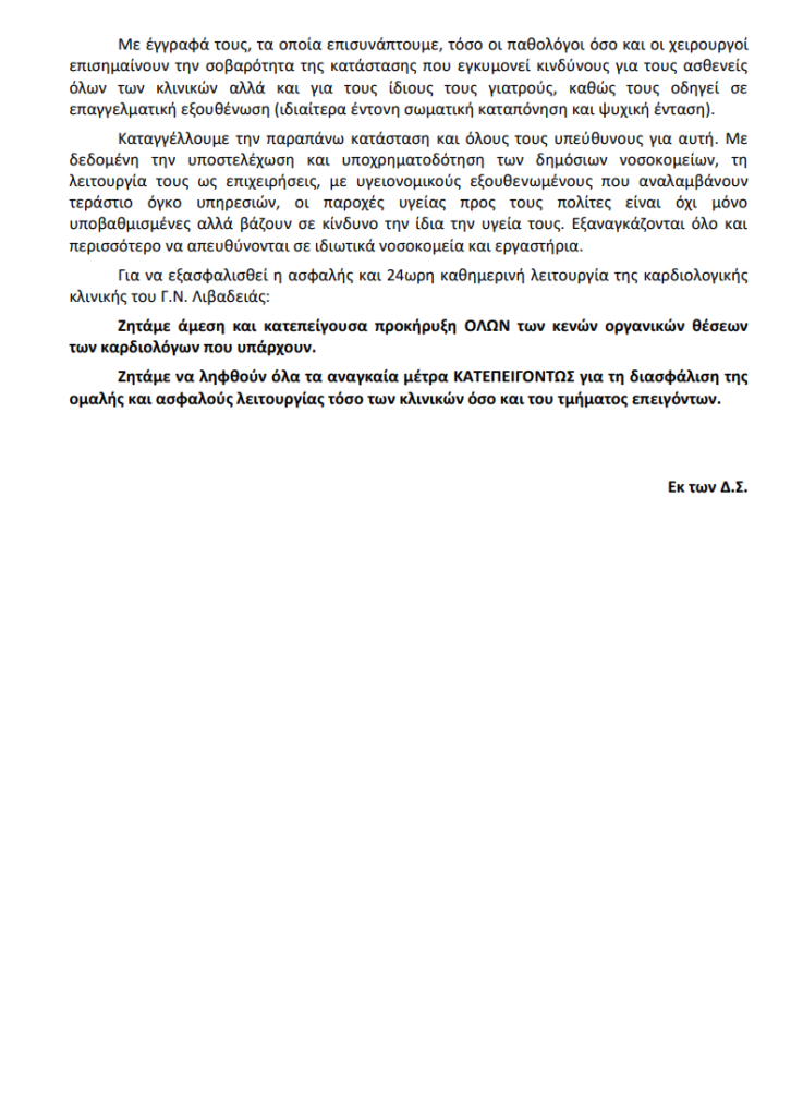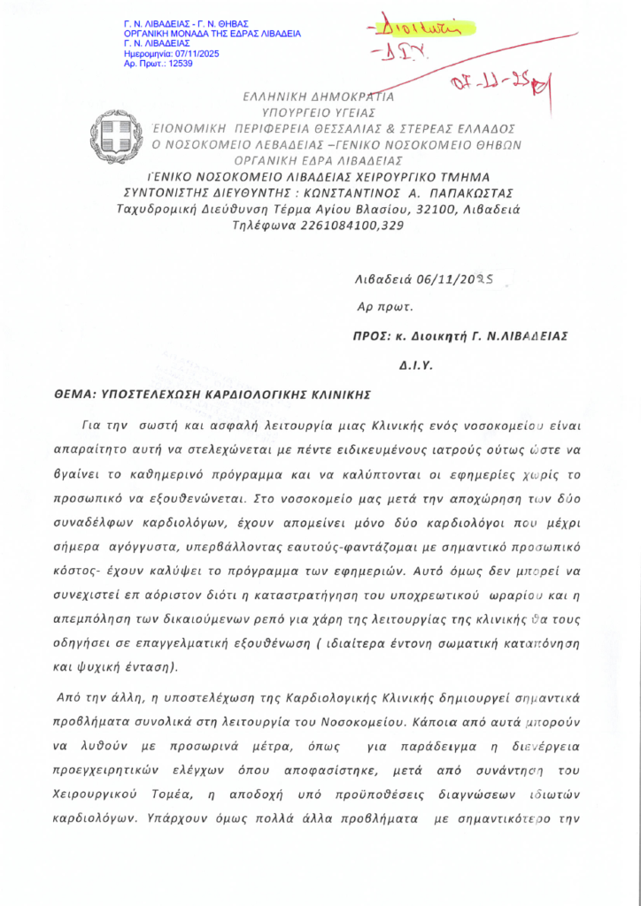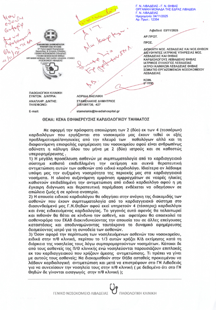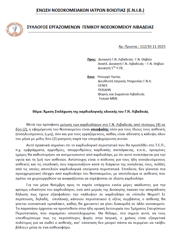 ΕΝΙΒ – Σύλλογος Εργαζομένων ΓΝ Λιβαδειάς: “Άμεση ενίσχυση της καρδιολογικής κλινικής και ΤΕΠ ΓΝ Λιβαδειάς” . 10 Νοεμβρίου 2025 10 Νοεμβρίου 2025 Δεν επιτρέπεται σχολιασμός στο ΕΝΙΒ – Σύλλογος Εργαζομένων ΓΝ Λιβαδειάς: “Άμεση ενίσχυση της καρδιολογικής κλινικής και ΤΕΠ ΓΝ Λιβαδειάς”