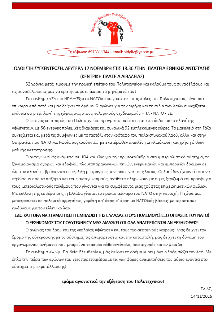 ΣΥΓΚΕΝΤΡΩΣΗ, ΔΕΥΤΕΡΑ 17 ΝΟΕΜΒΡΗ ΣΤΙΣ 18.30 ΣΤΗΝ ΠΛΑΤΕΙΑ ΕΘΝΙΚΗΣ ΑΝΤΙΣΤΑΣΗΣ ΓΙΑ ΤΟ ΠΟΛΥΤΕΧΝΕΙΟ
