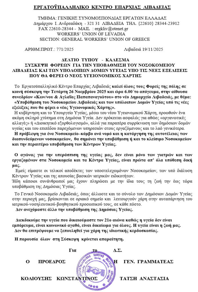 Σύσκεψη φορέων για τα ζητήματα της υγείας την Τετάρτη 26/11/2025 στις 6μμ στο νέο Δημαρχείο Λιβαδειάς