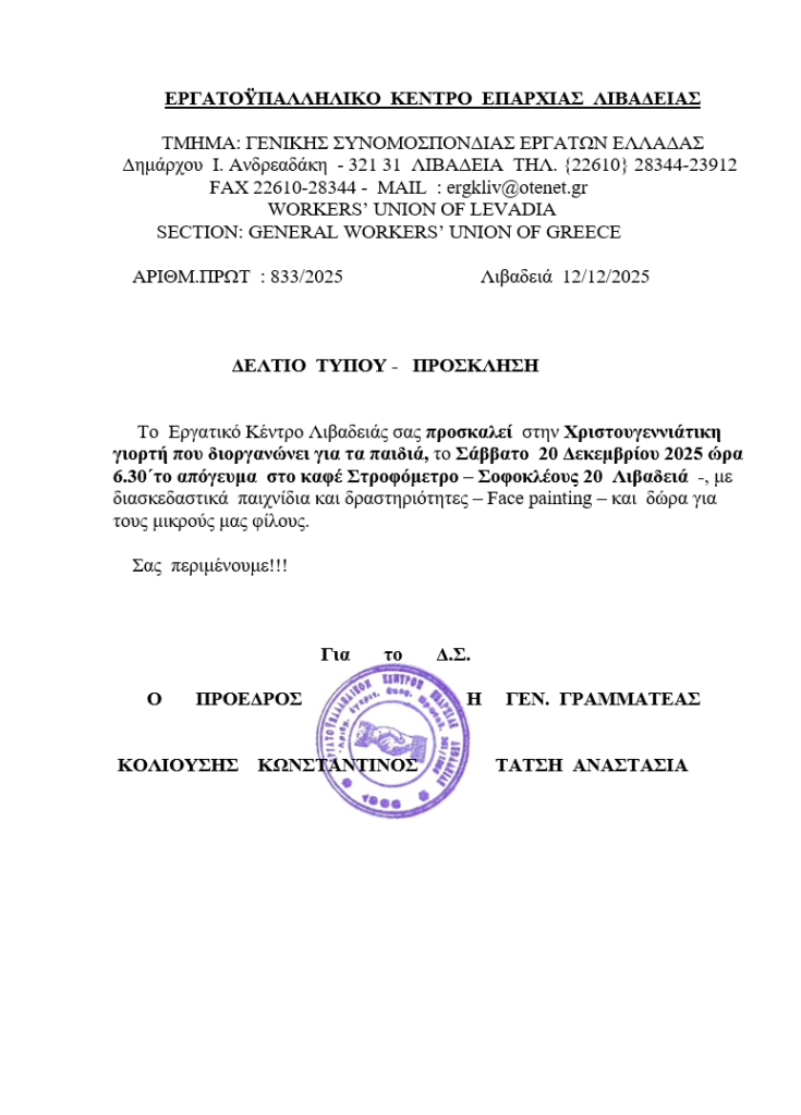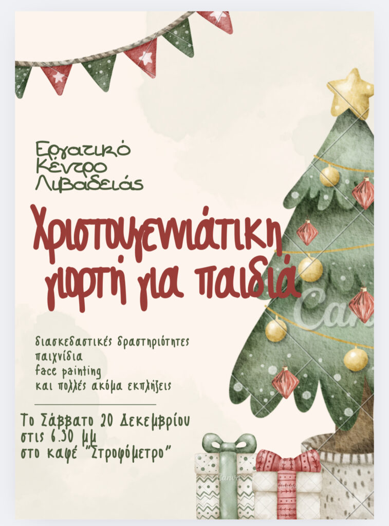 Χριστουγεννιάτικη γιορτή για τα παιδιά διοργανώνει το Εργατικό Κέντρο Λιβαδειάς . 12 Δεκεμβρίου 2025 12 Δεκεμβρίου 2025 Δεν επιτρέπεται σχολιασμός στο Χριστουγεννιάτικη γιορτή για τα παιδιά διοργανώνει το Εργατικό Κέντρο Λιβαδειάς