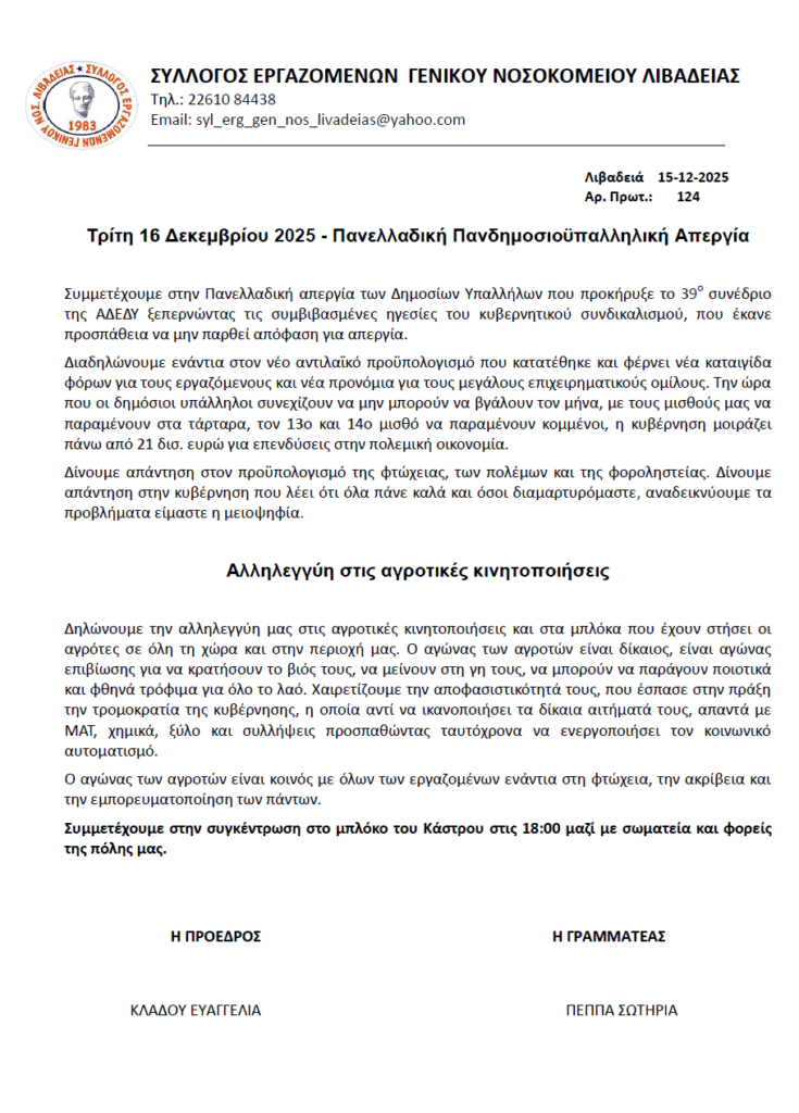 Σύλλογος Εργαζομένων Γ.Ν. Λιβαδειάς – Πανελλαδική Απεργία 16/12/2025 – Αλληλεγγύη στις αγροτικές κινητοποιήσεις