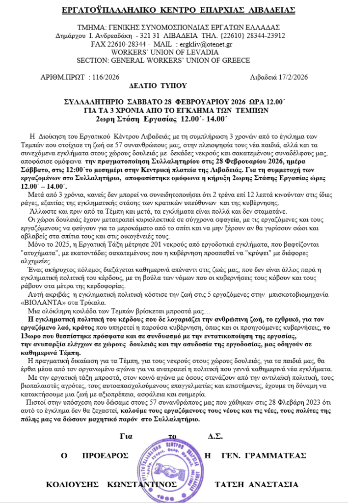 ΣΥΛΛΑΛΗΤΗΡΙΟ 28 ΦΕΒΡΟΥΑΡΙΟΥ 2026 ΓΙΑ ΤΑ 3 ΧΡΟΝΙΑ ΑΠΟ ΤΟ ΕΓΚΛΗΜΑ ΤΩΝ ΤΕΜΠΩΝ – 2ωρη Στάση Εργασίας 12:00 – 14:00 . 17 Φεβρουαρίου 2026 18 Φεβρουαρίου 2026 Δεν επιτρέπεται σχολιασμός στο ΣΥΛΛΑΛΗΤΗΡΙΟ 28 ΦΕΒΡΟΥΑΡΙΟΥ 2026 ΓΙΑ ΤΑ 3 ΧΡΟΝΙΑ ΑΠΟ ΤΟ ΕΓΚΛΗΜΑ ΤΩΝ ΤΕΜΠΩΝ – 2ωρη Στάση Εργασίας 12:00 – 14:00