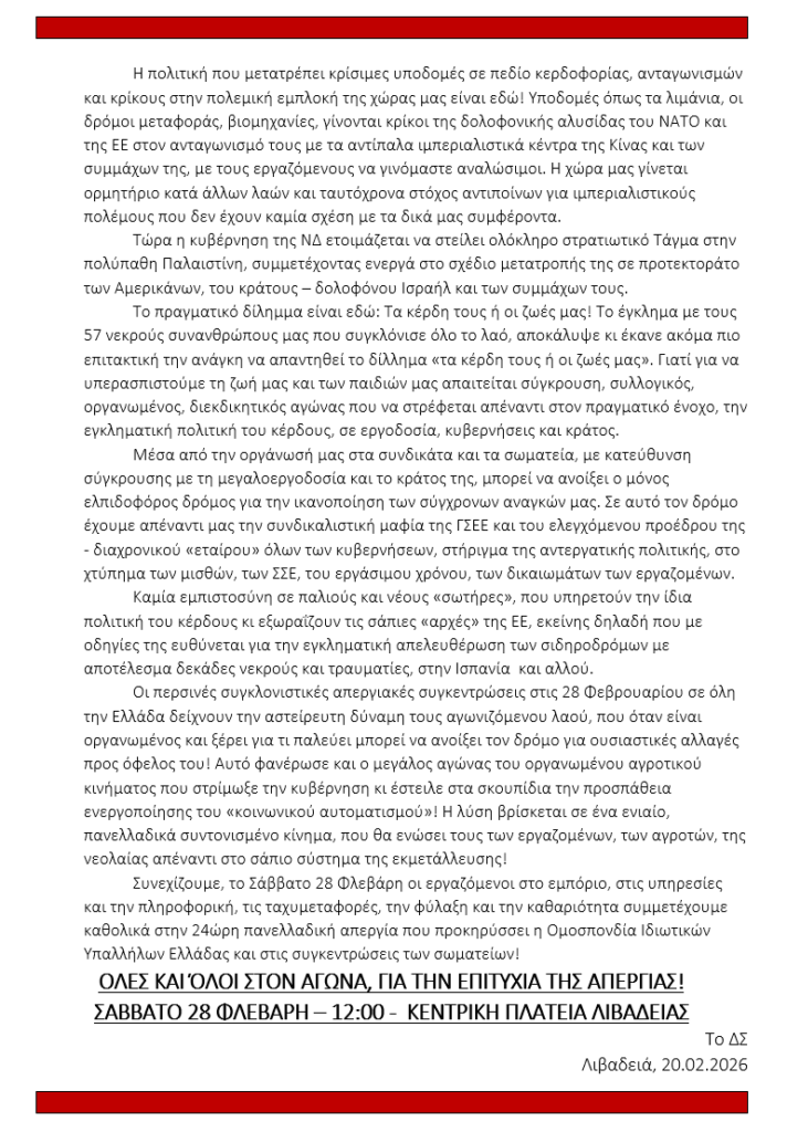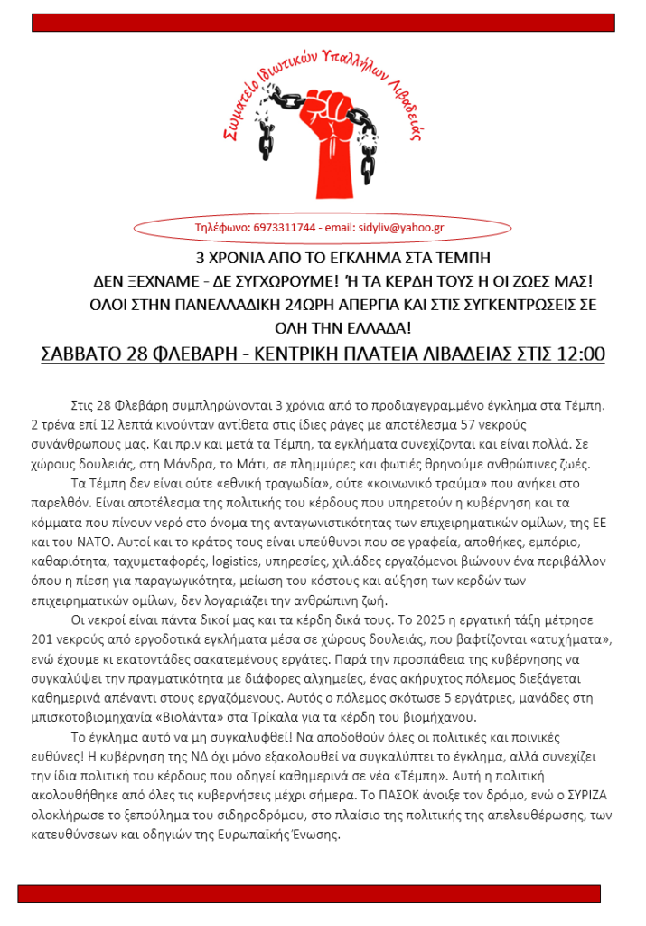 3 ΧΡΟΝΙΑ ΑΠΟ ΤΟ ΕΓΚΛΗΜΑ ΣΤΑ ΤΕΜΠΗ. ΔΕΝ ΞΕΧΝΑΜΕ – ΔΕ ΣΥΓΧΩΡΟΥΜΕ! Ή ΤΑ ΚΕΡΔΗ ΤΟΥΣ Η ΟΙ ΖΩΕΣ ΜΑΣ! . 20 Φεβρουαρίου 2026 20 Φεβρουαρίου 2026 Δεν επιτρέπεται σχολιασμός στο 3 ΧΡΟΝΙΑ ΑΠΟ ΤΟ ΕΓΚΛΗΜΑ ΣΤΑ ΤΕΜΠΗ. ΔΕΝ ΞΕΧΝΑΜΕ – ΔΕ ΣΥΓΧΩΡΟΥΜΕ! Ή ΤΑ ΚΕΡΔΗ ΤΟΥΣ Η ΟΙ ΖΩΕΣ ΜΑΣ!