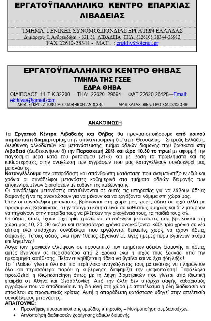 ΚΟΙΝΗ ΑΝΑΚΟΙΝΩΣΗ ΕΚ ΛΙΒΑΔΕΙΑΣ ΚΑΙ ΕΚ ΘΗΒΑΣ ΓΙΑ ΜΕΤΑΝΑΣΤΕΣ . 16 Μαρτίου 2026 20 Μαρτίου 2026 Δεν επιτρέπεται σχολιασμός στο ΚΟΙΝΗ ΑΝΑΚΟΙΝΩΣΗ ΕΚ ΛΙΒΑΔΕΙΑΣ ΚΑΙ ΕΚ ΘΗΒΑΣ ΓΙΑ ΜΕΤΑΝΑΣΤΕΣ