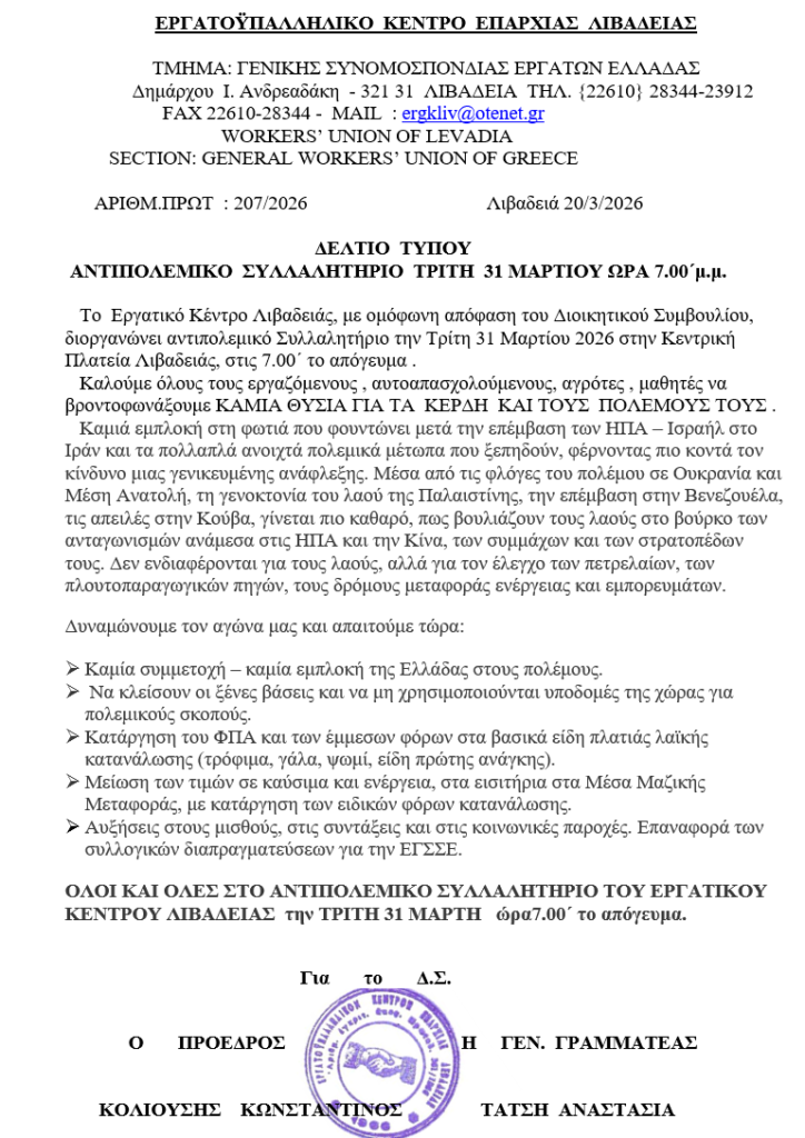 ΑΝΤΙΠΟΛΕΜΙΚΟ ΣΥΛΛΑΛΗΤΗΡΙΟ ΤΡΙΤΗ 31 ΜΑΡΤΙΟΥ ΩΡΑ 7.00΄μ.μ . 20 Μαρτίου 2026 20 Μαρτίου 2026 Δεν επιτρέπεται σχολιασμός στο ΑΝΤΙΠΟΛΕΜΙΚΟ ΣΥΛΛΑΛΗΤΗΡΙΟ ΤΡΙΤΗ 31 ΜΑΡΤΙΟΥ ΩΡΑ 7.00΄μ.μ