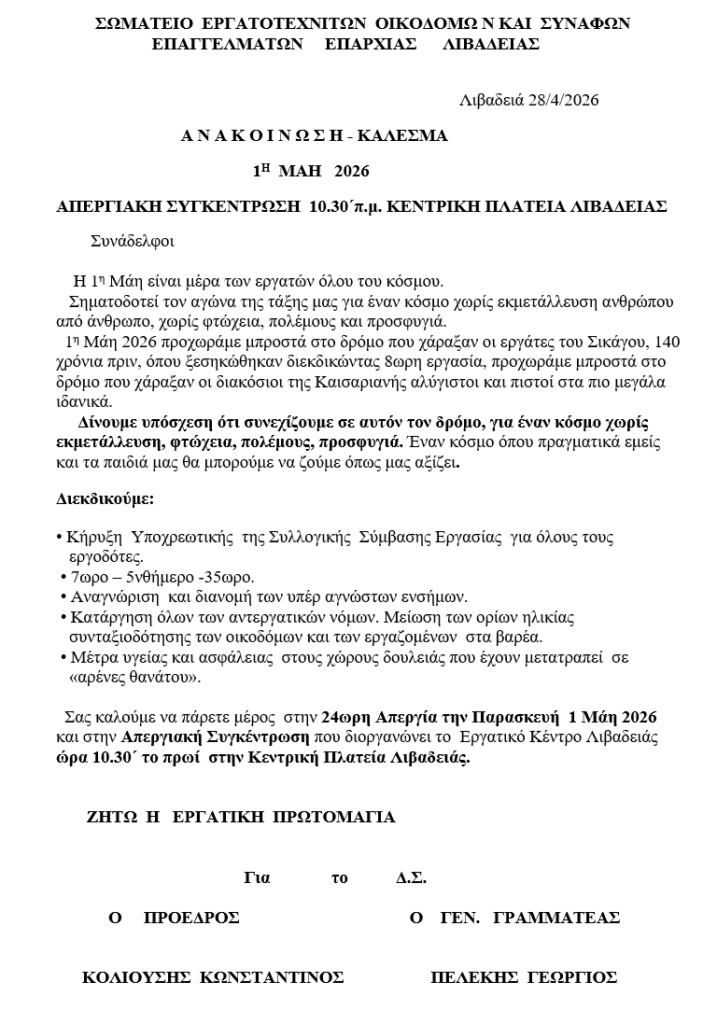 ΑΝΑΚΟΙΝΩΣΗ – ΚΑΛΕΣΜΑ ΣΩΜΑΤΕΙΟΥ ΟΙΚΟΔΟΜΩΝ ΛΙΒΑΔΕΙΑΣ . 29 Απριλίου 2026 29 Απριλίου 2026 Δεν επιτρέπεται σχολιασμός στο ΑΝΑΚΟΙΝΩΣΗ – ΚΑΛΕΣΜΑ ΣΩΜΑΤΕΙΟΥ ΟΙΚΟΔΟΜΩΝ ΛΙΒΑΔΕΙΑΣ